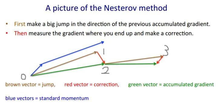 Nestrov也是一种动量更新的方式,但是与普通动量方式不同的是,Nestrov为了加速收敛,提前按照之前的动量走了一步,然后求导后按梯度再走一步。