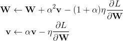 为了便于理解, W和v的更新可以看做是 空间中向量相加 的方式,这样一来,动量v就由0处的动量更新到了下一步的2处的动量。但是下一轮的W相应的应该在3处,所以W还要再走一步αv,即完整的更新过程应该如下所示: