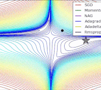各个算法在等高线的表现,它们都从相同的点出发,走不同的路线达到最小值点。可以看到,Adagrad,Adadelta和RMSprop在正确的方向上很快地转移方向,并且快速地收敛,然而Momentum和NAG先被领到一个偏远的地方,然后才确定正确的方向,NAG比momentum率先更正方向。SGD则是缓缓地朝着最小值点前进。