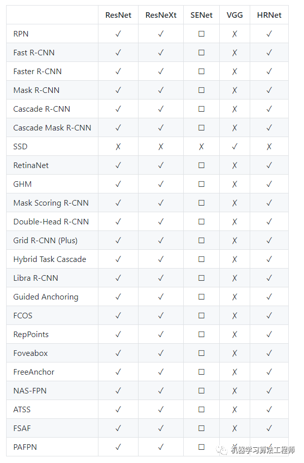 当然,更重要的是支持更多的模型,目前MMDetection已经支持持了35篇论文中的算法,提供了超过250 个预训练模型,是目标检测领域最大规模的模型库(这也是mmdet的最强的地方)。除此之外,还有 16 篇论文在 Github 上开源了基于 MMDetection 的代码。目前官方支持的方法如图所示:
