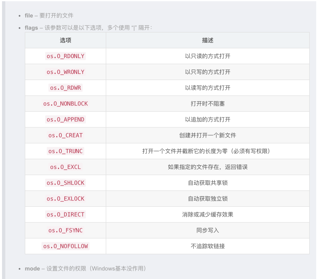 os.open() 方法用于打开一个文件,并且设置需要的打开选项,模式参数mode参数是可选的,默认为 0777。