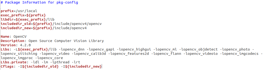 OPENCV_GENERATE_PKGCONFIG: 存放opencv4.pc,该文件的内容是存放了工程所需要的头文件路径和依赖库路径,这个很重要,因为你不用手动的去添加所需要的头文件路径和依赖库路径,opencv4.pc内容如下图:
