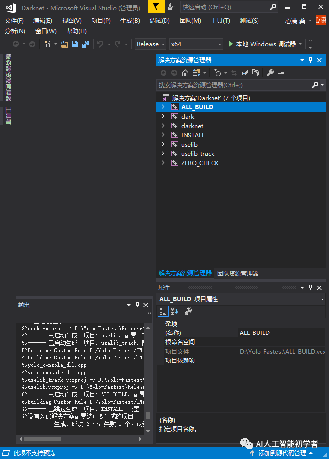 打开Visual Studio2017(具体根据你在configure时选择的编译环境,最好选择2017),选择release,然后生成解决方案;