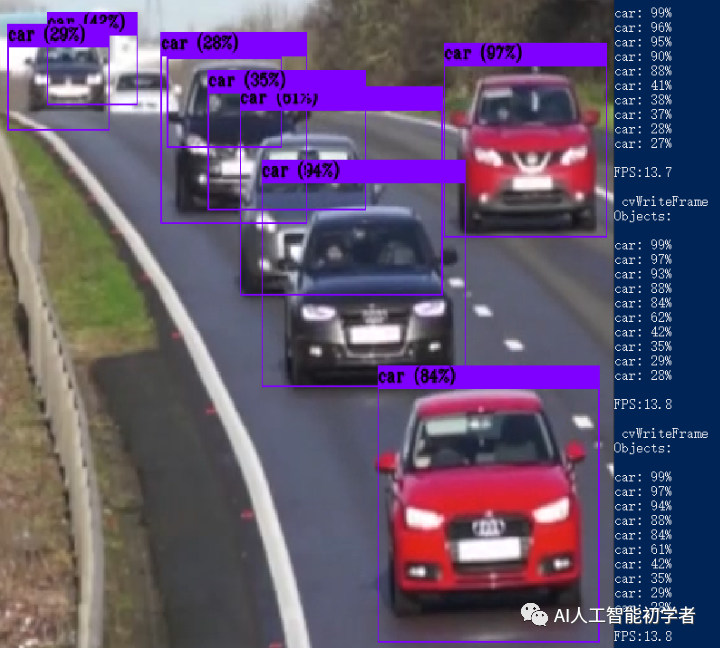 输入如下指令既可测试视频检测并输出检测的结果,CPU检测可以达到14FPS/s,比同等条件下使用GPU检测的YOLO-V4快很多:
