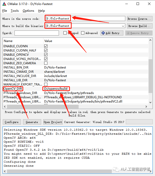 打开cmake,选择Yolo-Fastest文件夹为source code路径,Yolo-Fastest文件夹为目标文件夹;然后点击configure,再选择opencv.exe解压缩后的build文件夹为OPENCV_DIR的路径;