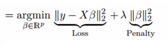 在这个公式中,有两个组成部分。第一个是最小二乘项,另一个是β2(β-平方)的λ倍,其中β是相关系数。为了收缩参数把它添加到最小二乘项中以得到一个非常低的方差。