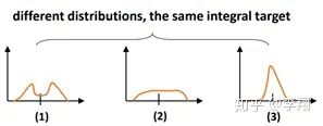 对于任意分布来建模框的表示,它可以用积分形式嵌入到任意已有的和框回归相关的损失函数上,例如最近比较流行的GIoU Loss。这个实际上也就够了,不过涨点不是很明显,我们又仔细分析了一下,发现如果分布过于任意,网络学习的效率可能会不高,原因是一个积分目标可能对应了无穷多种分布模式。如下图所示: