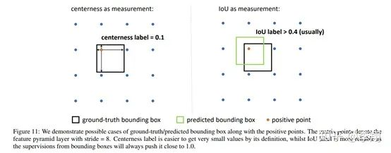 第一个彩蛋是关于IoU和centerness的讨论。在对比实验中,我们发现IoU作为框预测质量的度量会始终比centerness更优。于是我们又具体深入分析了一些原因,发现的确从原理上来讲,IoU可能作为质量的估计更加合适。具体原因如下: