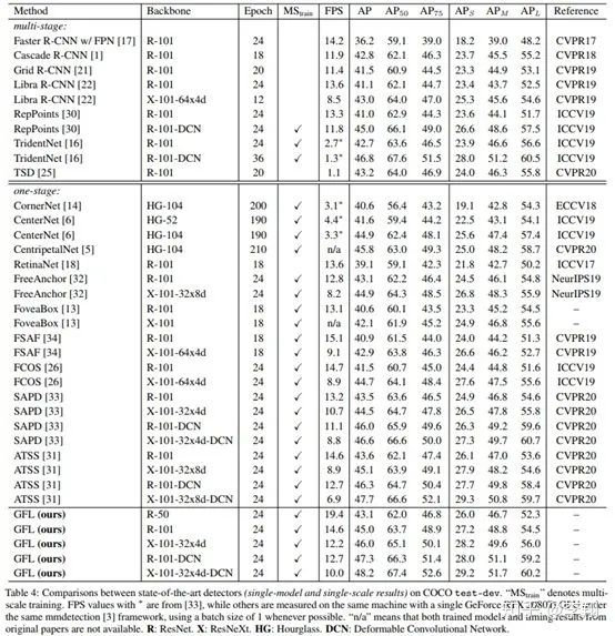 2. 在2x + multi-scale的训练模式下,在COCO test-dev上,Resnet50 backbone用GFL一把干到了43.1 AP,这是一个非常可观的性能。同时,基于ResNeXt-101-32x4d-DCN backbone,能够有48.2的AP且在2080Ti单GPU上有10FPS的测速,还是相当不错的speed-accuracy trade-off了。