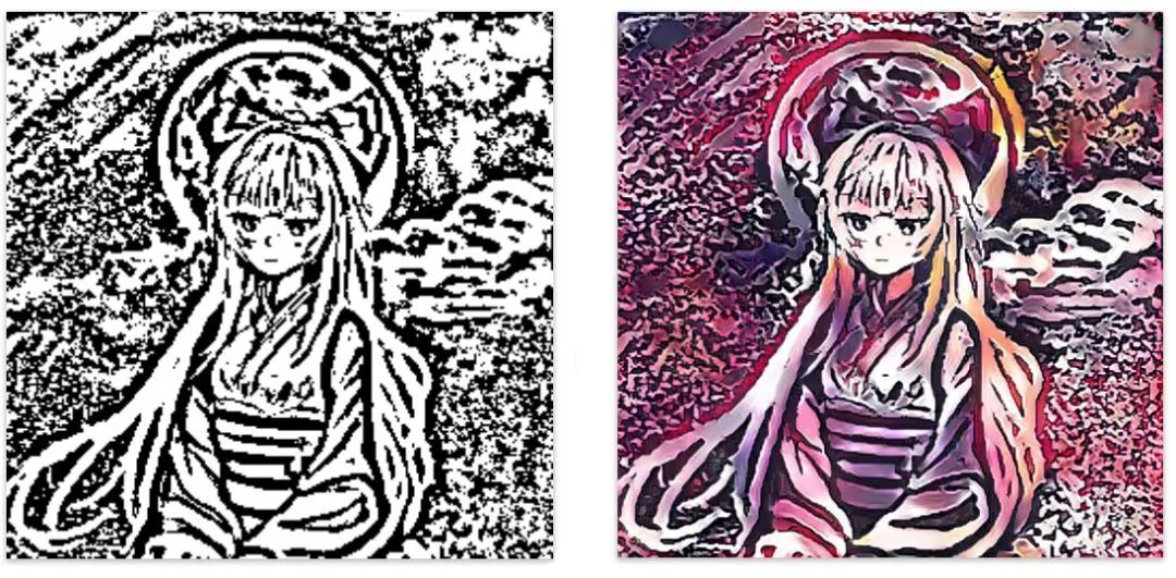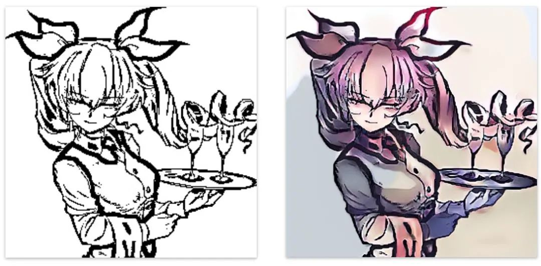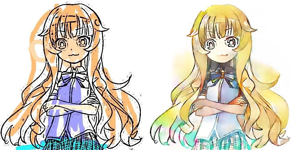 下面的左图由 PaintsChainer 提供,右图由最终的模型上色:
