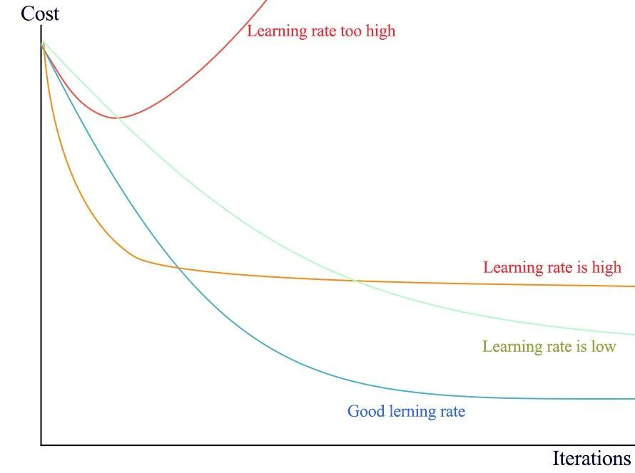 我们没有使用固定的学习率,而是定期降低学习率。超参数包括学习率下降的频率和幅度。例如,你可以在每十万次迭代时减少 0.95 的学习率。要调整这些参数,我们需要监控成本,以确定参数下降地更快但又不至于过早平缓。