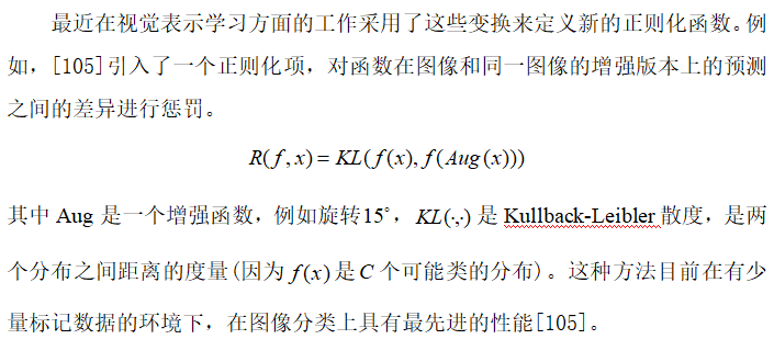 最近在视觉表示学习方面的工作采用了这些变换来定义新的正则化函数。例如,[105]引入了一个正则化项,对函数在图像和同一图像的增强版本上的预测之间的差异进行惩罚。