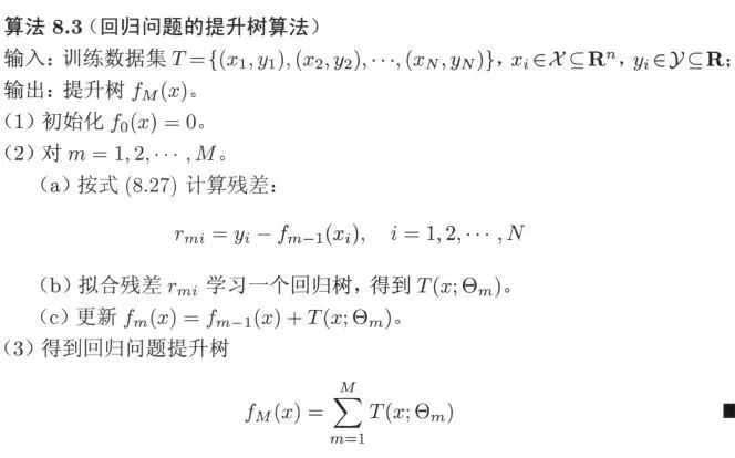 其中2.a步是计算残差,2.b步通过把2.a的残差当作标签,可以使用线性回归的方法进行拟合残差。通过M次循环一共得到M+1颗树,每个输入数据X的结果,是M+1棵树预测的结果之和。