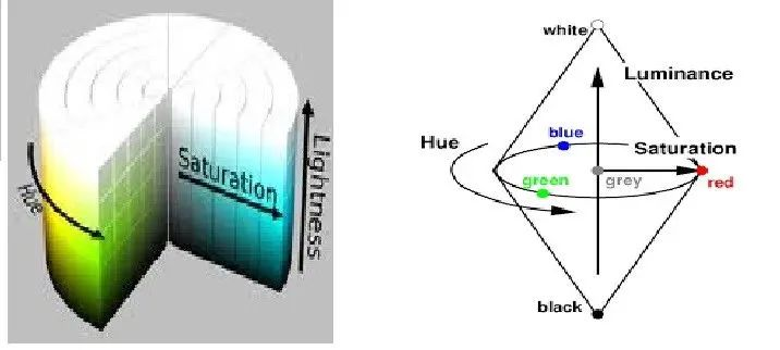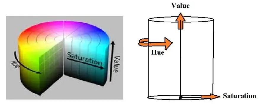HSV这个名字来自于颜色模型的三个坐标,即色相、饱和度和值。它也是一个圆柱形的颜色模型,圆柱体的半径表示饱和度,垂直轴表示值,角度表示色调。对于观察者,色调是占主导地位的,饱和度是混合到色调中的白光的数量,value是chrome的强度,value较低颜色变得更加类似于黑色,value越高,颜色变得更加像颜色本身。通过改变这些参数,我们可以生成不同的颜色。