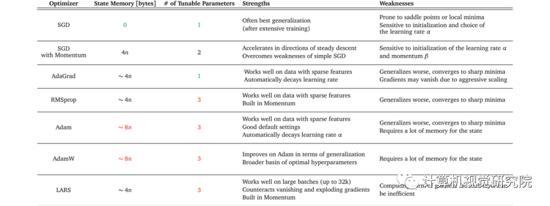 下表 1 概述了几种优化器的优缺点。读者可以尝试找到与数据集特征、训练设置和项目目标相匹配的优化器。某些优化器在具有稀疏特征的数据上表现出色,而有一些将模型应用于先前未见过的数据时可能会表现更好。一些优化器在大批处理量下可以很好地工作,而另一些优化器会在泛化不佳的情况下收敛到极小的最小值。