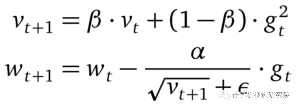 RMSprop 是一个未发布的优化器,但在最近几年中已被过度使用。其理念类似于 AdaGrad,但是梯度的重新缩放不太积极:用平方梯度的移动均值替代平方梯度的总和。RMSprop 通常与动量一起使用,可以理解为 Rprop 对小批量设置的适应。