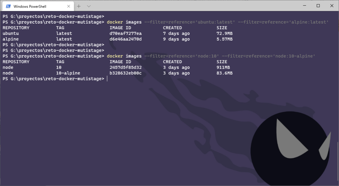 通常,相较于基于其他 Linux 发行版(例如 Ubuntu)的镜像,基于 Alpine 或 BusyBox 的镜像非常小。这是因为 Alpine 镜像和类似的其他镜像都经过了优化,其中仅包含最少的必须的软件包。在下面的图片中,你可以看到 Ubuntu、Alpine、Node 和基于 Alpine 的 Node 镜像之间的大小比较。