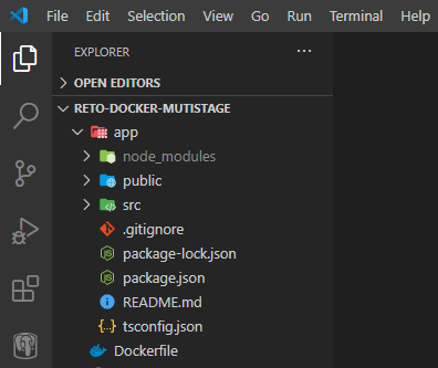 让我们从一个示例开始,在该示例中,我们构建了一个 React 应用程序并将其容器化。运行 npx 命令并创建 Dockerfile 之后,我们得到了如图 1 所示的文件结构。