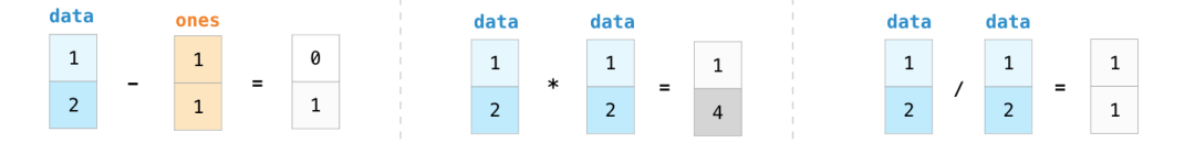 如果两个矩阵大小相同,我们可以使用算术运算符(+-*/)对矩阵进行加和乘。NumPy 将它们视为 position-wise 运算: