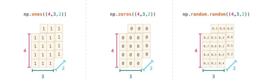 np.array([[1,2],[3,4]])我们也可以使用上面提到的方法(ones()、zeros() 和 random.random()),只要写入一个描述我们创建的矩阵维数的元组即可: