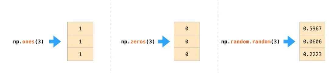通常我们希望 NumPy 能初始化数组的值,为此 NumPy 提供了 ones()、zeros() 和 random.random() 等方法。我们只需传递希望 NumPy 生成的元素数量即可: