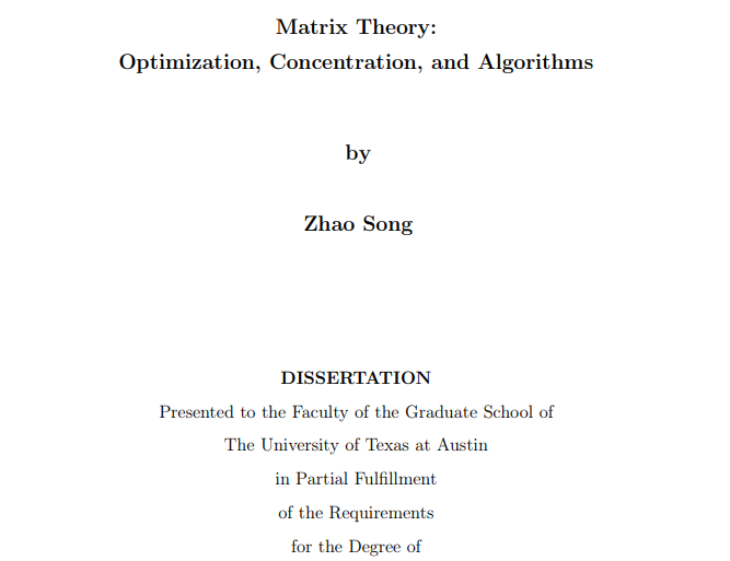 论文作者 Zhao Song 本科毕业于西蒙菲沙大学,获得了计算机科学学士学位,博士毕业于德克萨斯大学奥斯汀分校计算机科学系,由 Eric Price 教授指导。在进入德克萨斯大学之前,Zhao Song 曾是哈佛大学的访问学者,也在 IBM 研究中心实习过。