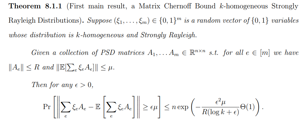 如下为定理 8.1.1:k 均匀强瑞利分布(Strongly Rayleigh Distribution)的矩阵切尔诺夫边界。