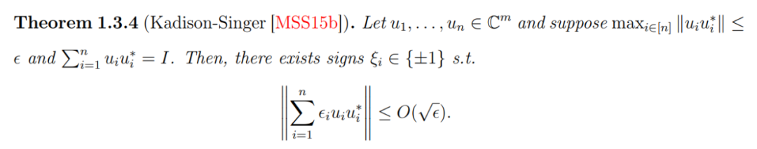 斯宾塞定理是差异理论中的一个著名结果,但如何将斯宾塞定理泛化至矩阵设置中这个重要问题却没有得到解决。作者在这方面取得了一些进展,并证明了在某些限制设置条件下斯宾塞定理可以实现矩阵泛化。并且,文中的结果可以泛化至著名的卡迪森 - 辛格猜想(Kadison-Singer conjecture)问题。