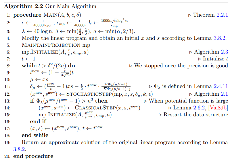 首先,他探究了矩阵在优化算法中的作用。作者研究了大量的矩阵优化问题,并针对线性规划、经验风险最小化、常微分方程和深度神经网络提供了新的求解方法和结果。其中,在线性规划优化问题中,作者提出了一种在当前矩阵乘法时间上运行的新算法,并表示 gaisuan「解决了停滞了三十年之久的研究障碍」。此外,该算法可以泛化至多种多样的凸优化问题,即经验风险最小化问题。具体算法如下所示:
