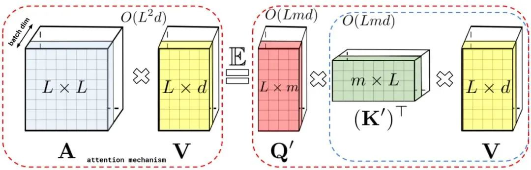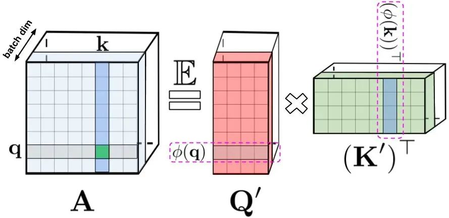 在以往的注意力机制中,分别对应矩阵行与列的 query 和 key 输入相乘,通过 softmax 计算形成一个注意力矩阵,以存储相似度系数。值得注意的是,这种方法不能将 query-key 生成结果传递给非线性 softmax 计算之后再将其分解为原始的 query 和 key。然而,将注意力矩阵分解为原始 query 和 key 的随机非线性函数的乘积是可以的,即所谓的随机特征(random feature),这样就可以更加高效地对相似度信息进行编码。