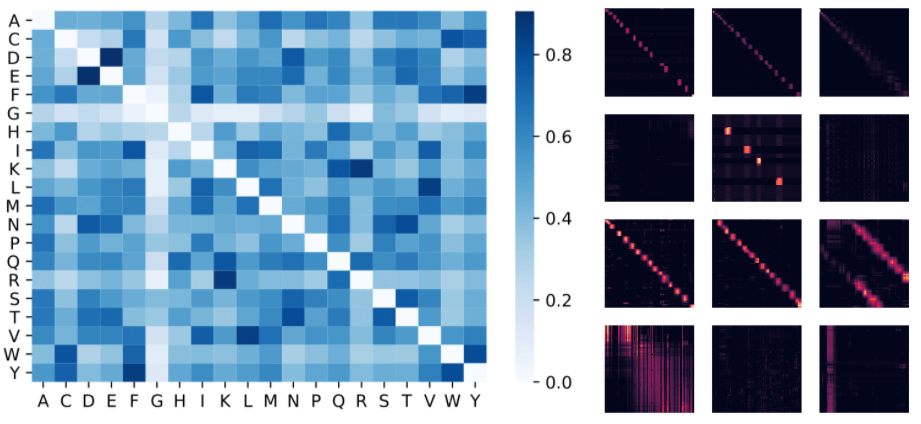 左:从注意力权重估计氨基酸相似性矩阵。该模型可以识别高度相似的氨基酸对,例如 (D,E) 和 (F,Y)。