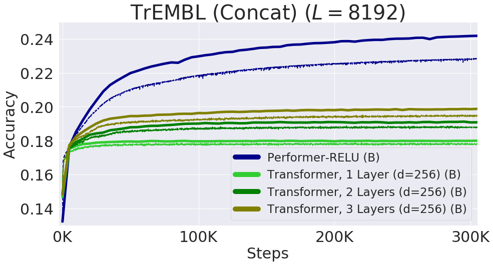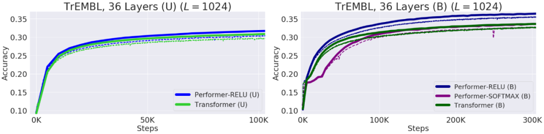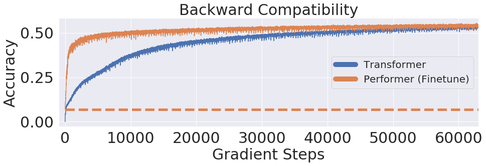 在 One Billion Word Benchmark (LM1B) 数据集上,研究者将原始预训练 Transformer 的权重迁移至 Performer 模型,使得初始非零准确度为 0.07(橙色虚线)。但在微调之后,Performer 的准确度在很少的梯度步数之后迅速恢复。