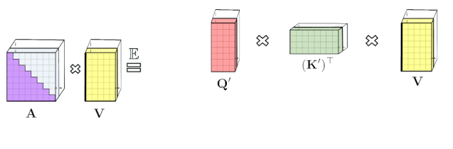 左:标准注意力模块计算,其中通过执行带有矩阵 A 和值张量 V 的矩阵乘法来计算最终的预期结果;右:通过解耦低秩分解 A 中使用的矩阵 Q′和 K′以及按照虚线框中指示的顺序执行矩阵乘法,研究者获得了一个线性注意力矩阵,同时不用显式地构建 A 或其近似。