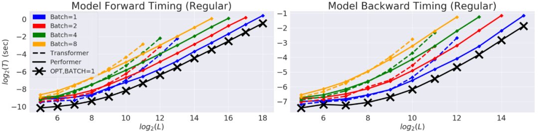 在以时间(T)和长度(L)为度量的双对数坐标轴中,常规 Transformer 模型的双向 timing。