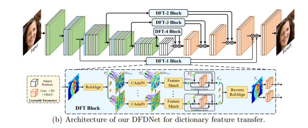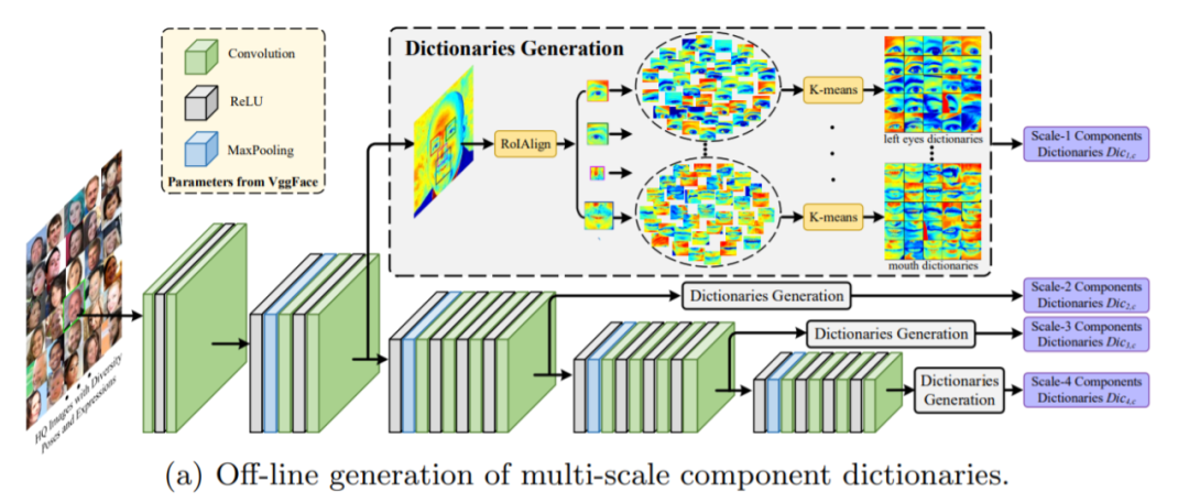 网络主要包含两个部分:a. 从大量包含各种姿态和表情的高质量图像中离线生成多尺度组件字典。这部分使用 K-means 算法为每个部位(即左 / 右眼、鼻子和嘴)在不同尺度上生成 K 个簇;b. 修复过程和字典特征迁移(DFT)块,用于以渐进的方式提供参考细节。
