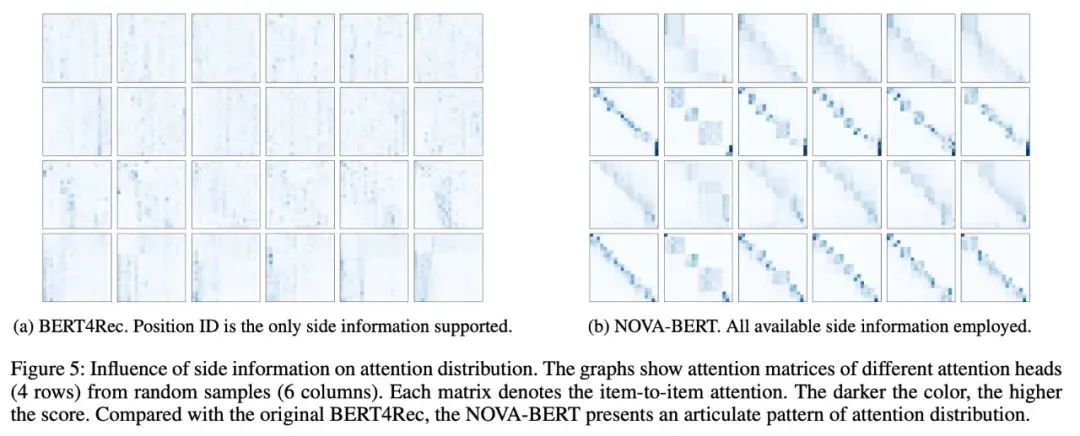 根据我们对整个数据集的观察,这种对比是普遍存在的。我们注意到侧边信息导致模型在早期层次形成更明显的attention。实验结果表明,NOVA-BERT算法以side信息作为计算attention矩阵的辅助工具,可以学习目标的注意分布,从而提高计算的准确性。