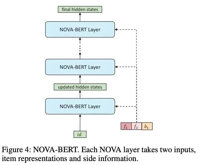 对于第一层的输入,商品表示是纯商品ID嵌入。由于我们只使用side信息作为辅助来学习更好的注意分布,side信息不会随着NOVA层传播。为每个NOVA层明确提供相同的side信息集。