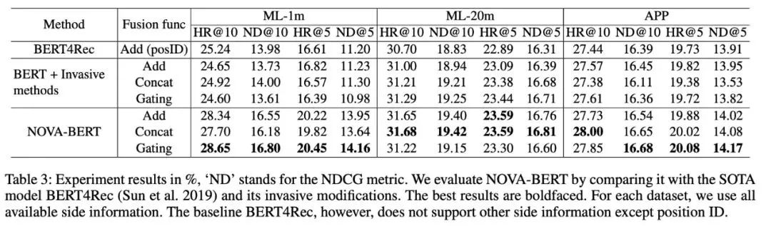 与Bert4Rec仅利用位置ID相比,invasive式方法使用了多种side信息,但改进非常有限甚至没有正向效果。相反,NOVA-BERT方法能有效地利用side信息,性能稳定,优于其他方法。