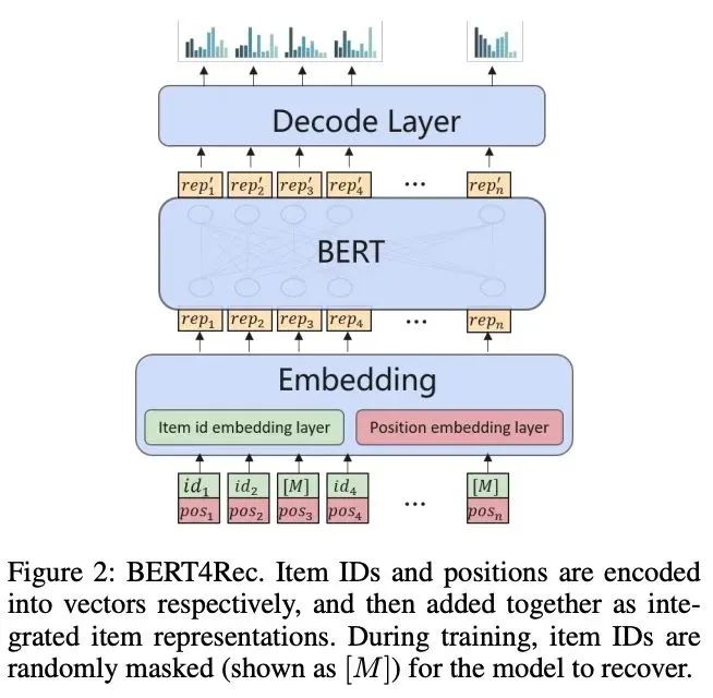 其中是softmax函数,是比例因子。BERT使用encoder decoder的设计形式对每个输入的序列中的商品产出一个上下文的表示,BERT使用embedding层来存储个向量,每个对应词典中的一个商品。
