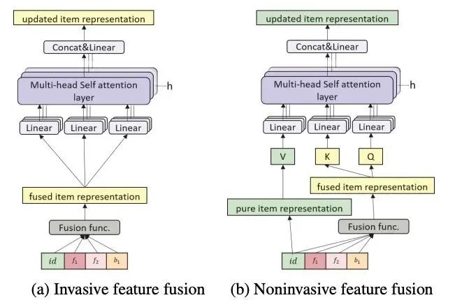 NOVA和invasive方法在使用side信息下的不同在于,NOVA将其作为一个辅助的并通过fusion函数将side信息作为Keys和Querys输入。此处我们定义concatfusion, 来将所有的side信息进行fusion,后面会接一个全链接层。