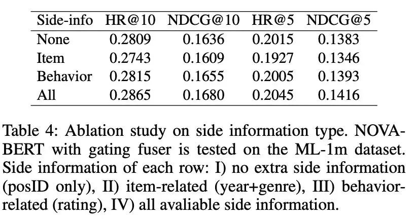 提出了NOVA-BERT框架,该框架可以有效地利用各种side信息进行序列化的推荐任务;