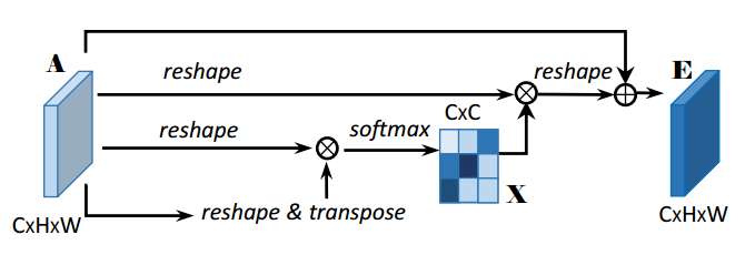 在通道注意力模块中,通道注意力图X∈R (C×C)是从原始特征图A∈R (C×H×W)中直接计算出来的。具体来说,将A reshape 成R(C×N),然后将A与A的转置进行矩阵乘法,最后应用softmax层得到通道注意力图X∈R(C×C)。此外,在X和A的转置之间进行矩阵乘法,其结果被reshape为R (C×H×W)。然后将结果与尺度参数β相乘,并与A进行元素求和运算,得到最终输出E∈R (C×H×W)。参数β从0逐步学习权值。