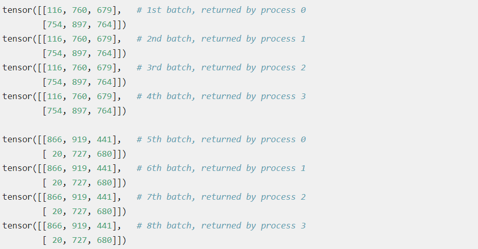 示例 1 为一个示例数据集,它返回三个元素的随机向量。示例使用两个和四个工作进程的 batch 大小。
