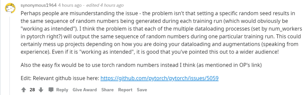 用户「synonymous1964」进一步解读了这个 bug。ta 认为,人们可能误解了这个问题,问题不在于设置特定的随机种子会导致每次训练过程中生成相同序列的随机数,这显然是按预期工作的。相反,问题在于多个数据下载进程中(由 PyTorch 中的 num_workers 设置)的每个进程都会在某个特定的训练过程中输出相同序列的随机数。毫无疑问,这当然会对项目造成影响,具体取决于你如何进行数据加载和扩充。所以,即使这个 bug 是「按预期工作的」,但向更多其他用户指出来也挺好的。
