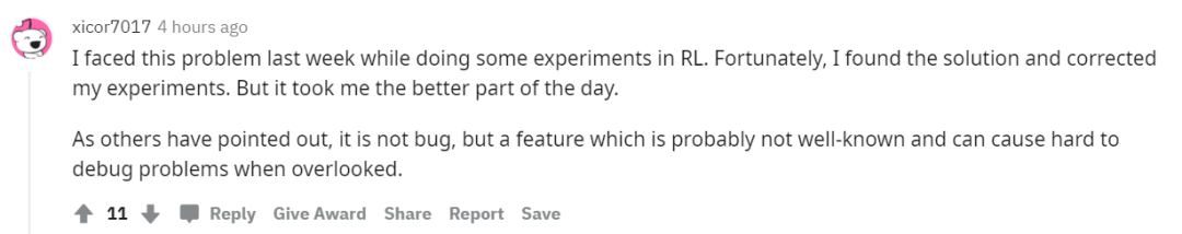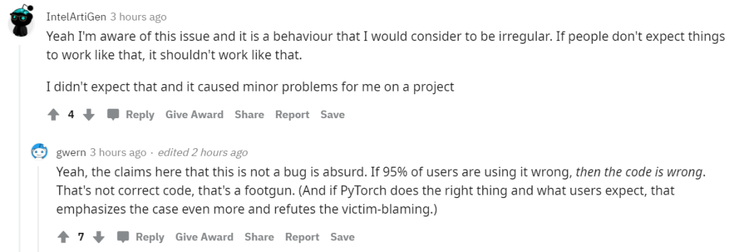 用户「IntelArtiGen」称自己意识到了这个 bug,认为它是不正常的,并且对自己的项目造成了一些小问题。用户「gwern」赞同这种观点,认为如果 95% 以上的用户使用时出现错误,则代码就是错的。