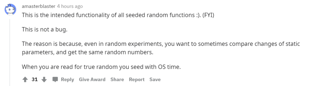 用户「amasterblaster」认为,这不是一个 bug,而是所有种子随机函数的预期功能。这是因为即使在随机实验中,有时你想要对比静态参数的变化,并得到相同的随机数。只有当你被读为真随机(true random)时,才会根据 OS time 设置 seed。
