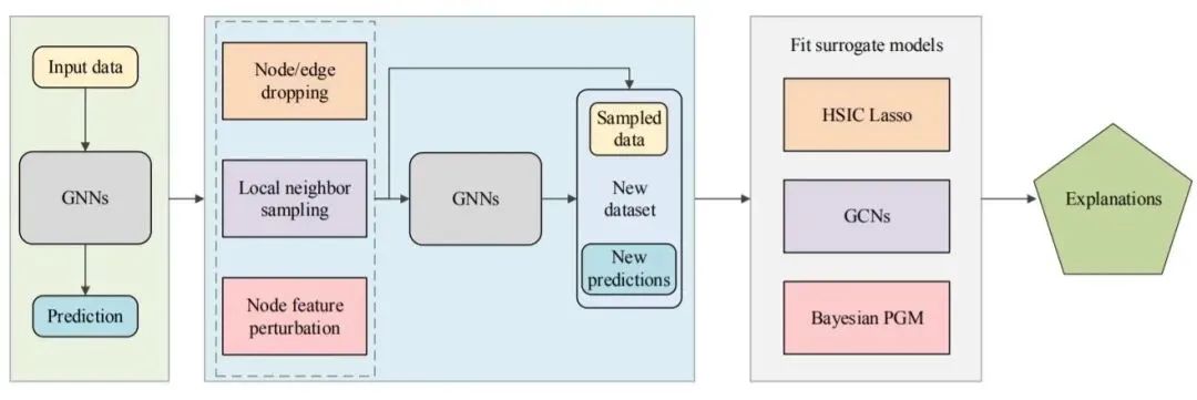 这些方法的一般流程如图3所示。为了解释给定输入图的预测,它们首先获得一个包含多个相邻数据对象及其预测的局部数据集。然后拟合一个可解释模型来学习局部数据集。来自可解释模型的解释被视为原始模型对输入图的解释。不同代理模型关键的区别在于两个方面:如何获得局部数据集和选择什么代理模型。