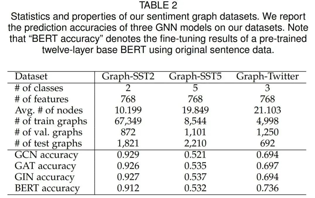 作者建立了三个情感图数据集,分别为Graph-SST2、Graph-SST5和Graph-Twitter ,并即将公开,可以直接用于研究不同的可解释技术。这些数据集的统计和属性如表2所示。为了验证本文生成的情感数据集具有可解释信息,作者分别再新生成的情感数据集和原始数据集进行实验。作者展示了两层GNNs在这些数据集上的预测精度,包括GCNs、GATs和GINs。还展示了使用原始句子数据集的预训练的BERT[72]的微调精度。结果表明,与原始句子数据集相比,作者构建的情感图数据集可以达到具有竞争力的性能,这些数据集是实现图模型解释的合理选择。根据不同词的语义和情感标签,我们可以研究可解释方法是否能识别出具有关键意义的词以及不同词之间的关系。