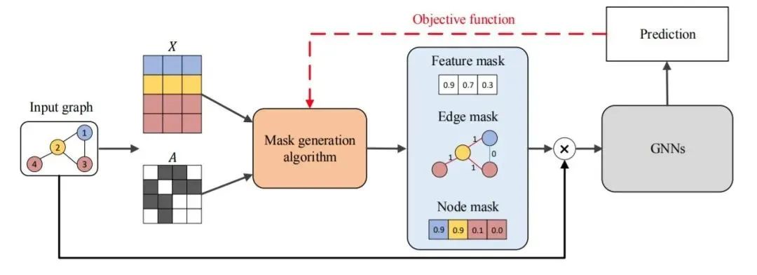 接下来将详细的介绍目前存在的几种基于扰动的解释性方法,我们可以重点关注它们的作用对象(节点或边或节点特征),以及它们的掩码生成算法、掩码类型和目标函数。