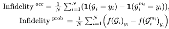 Fidelity度量通过去除重要节点/边/节点特征来研究预测变化。相反,Infidelity度量通过保留重要的输入特征和去除不重要的特征来研究预测变化。直观地讲,重要特征应该包含判别信息,因此即使去掉不重要的特征,它们也应该导致与原始预测相似的预测。从形式上看,度量Infidelity可以计算为:
